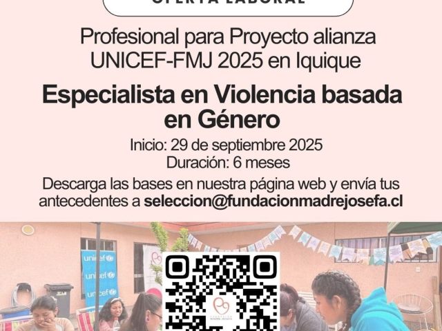La Fundación Madre Josefa (FMJ), en alianza con UNICEF, invita a postular al cargo de Profesional de Apoyo Especialista en Violencia Basada en Género (VBG) para desempeñarse en el Centro de Acogida Transitoria (CAT) de Iquique, en el marco del proyecto “Red de Protección a la Niñez y Mujeres...